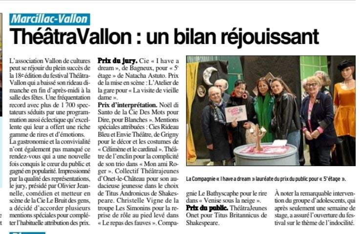 La Compagnie I Have a Dream remporte le Prix du Jury avec Cinquième Étage au festival ThéâtraVallon (FR).