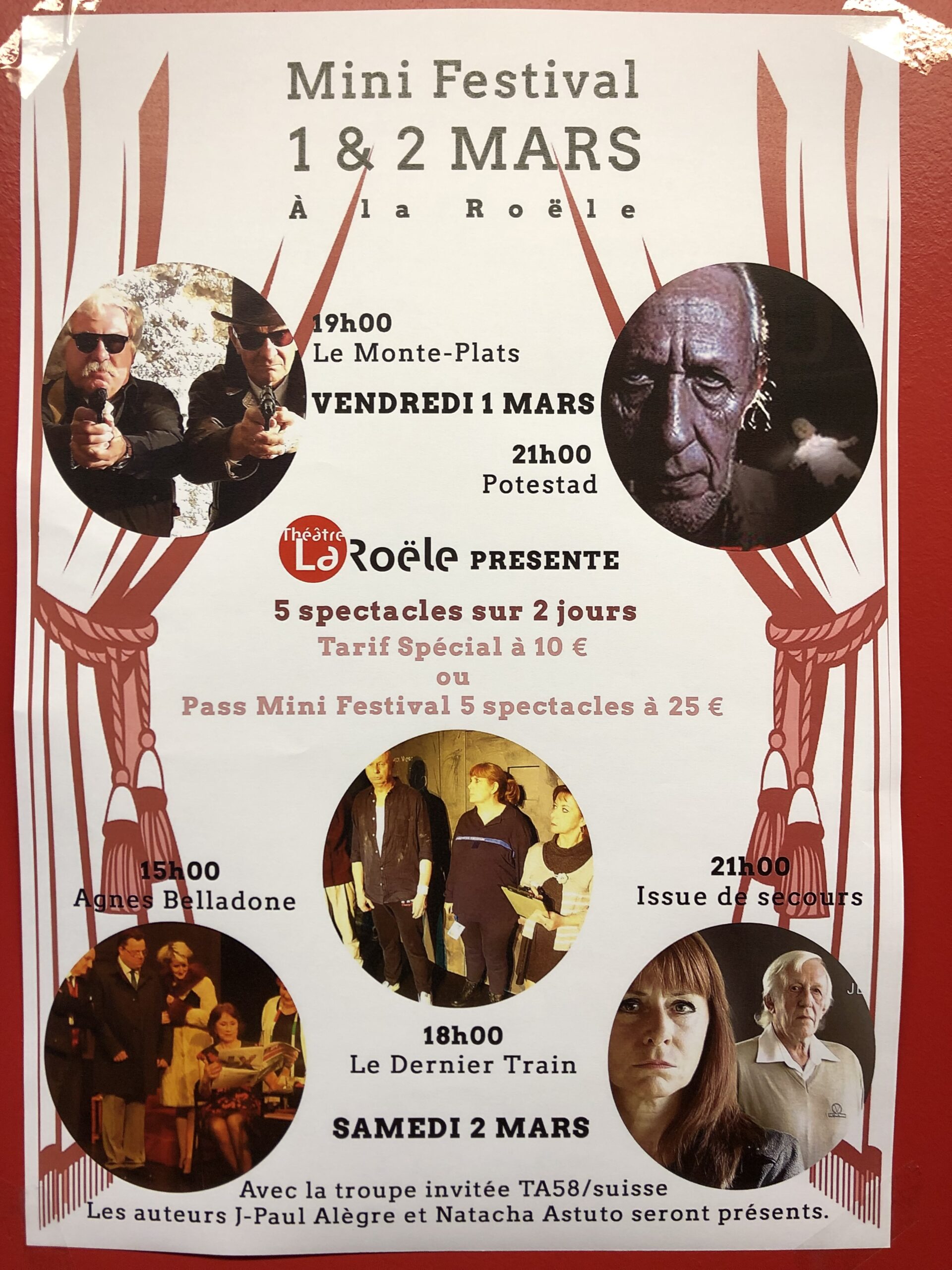 A l’initiative de l’infatigable directeur du Théâtre de la Roële, Patrick Schoenstein – qui est également le président national de la FNCTA et un redoutable comédien et metteur en scène – un mini-festival à la Roële près de Nancy permet une géniale interconnexion entre Jean-Paul Alègre, Natacha Astuto, la Compagnie TA58 et la Compagnie du Théâtre de la Roële.